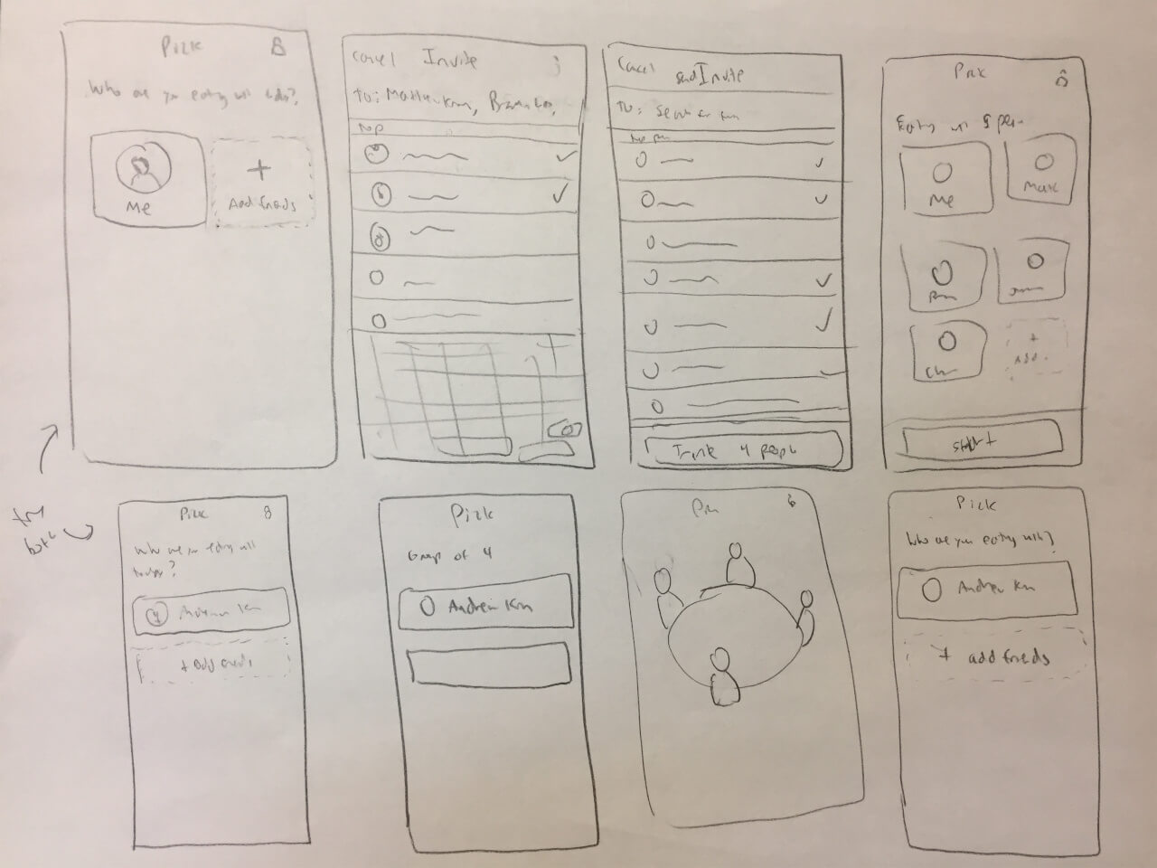 The "Forming Your Group" screens were the ones I struggled the most with, despite it being a simple friend inviting type of process. Something that really tripped me up was my attachment to the square card idea that I had in my initial wireframe. You can see my attempts to force the idea to work in the first four iterations above.